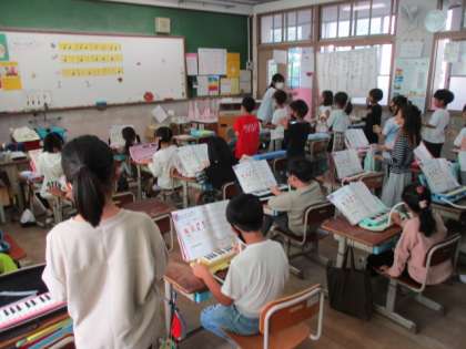 「手のひらを太陽に」や「大きな古都計」の歌をみんなで歌い、「山のポルカ」の合奏をしました。