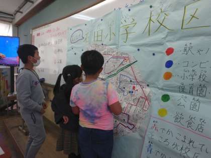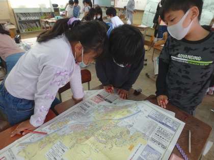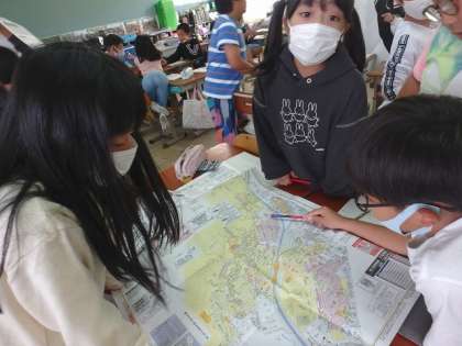校区の中で危険な場所やなくしたほうがよいものについて話し合いました。子どもたちは地図を見ながら「ここは電気がないから夜になると…」「この道路は狭くて車が…」とたくさんのことを話し合っていました。