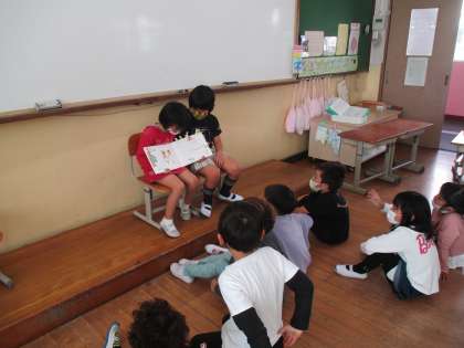 係活動の中に本係があります。クラスのみんなに読み聞かせをしたいということで、絵本の読み聞かせをしてくれました。自主的に活動する姿がすてきです。