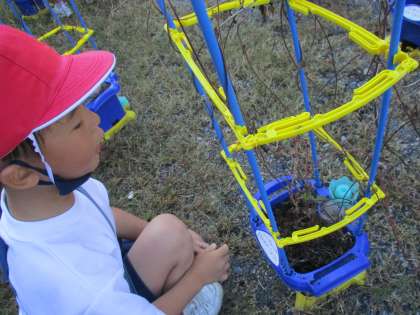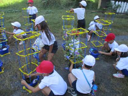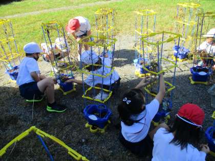 アサガオのつるを使ってリース作りをしました。たくさん伸びたつるを支柱から外すのがとても大変でした。