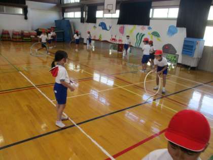 フラフープを体を使ってまわしてみたり、ペアになって真っすぐ転がしてみたり。