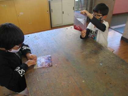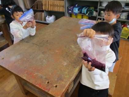アサガオのいろ水あそびをしました。冷凍保存しておいたアサガオの花をしぼるとたくさんのいろ水が出てきました。