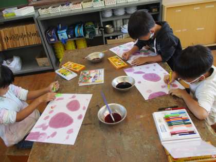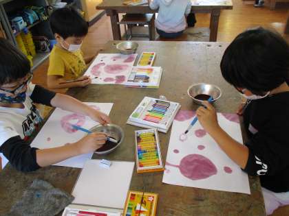 アサガオのいろ水を使ってお絵かきをしました。クレパスやクーピーを使ってかきたすことですてきな作品が出来上がりました。