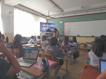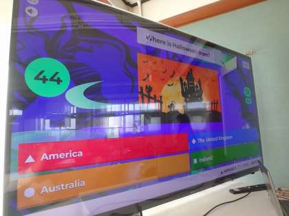 ALTの先生にハロウィンクイズをしていただきました。子どもたち,大盛り上がり!