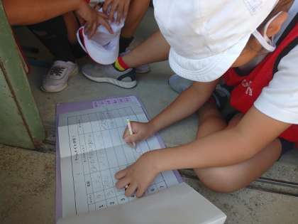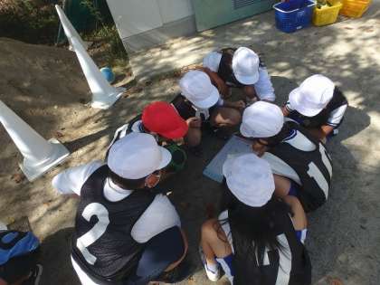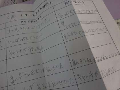 ポートボールの学習2時間目です。チームのカードにある「チームメイト分析」のプリントにも,次々と気付いたことが書き込まれています!