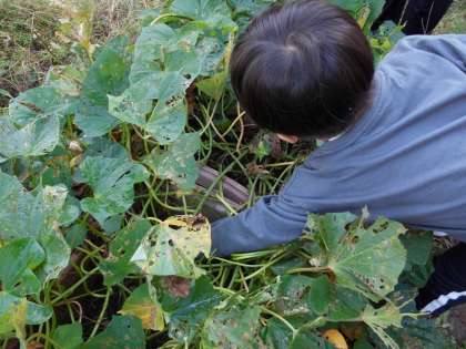 子どもたちは葉っぱをめくってはちらっと見えるおいもにワクワクしています。