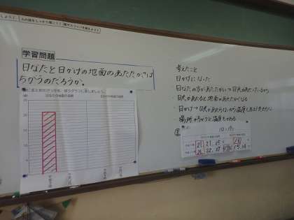 前の時間の実験で分かったことをまとめました。日なたや日陰の温度を棒グラフに表すと,日なたの方が地面の温度が高いことに気付くことができました。
