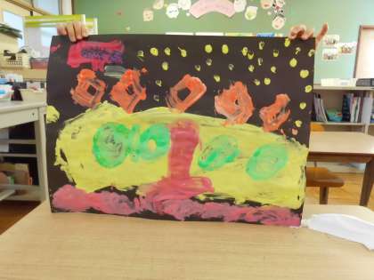 手や指で,とろとろの感触を味わいながら好きな電車の絵をかきました。