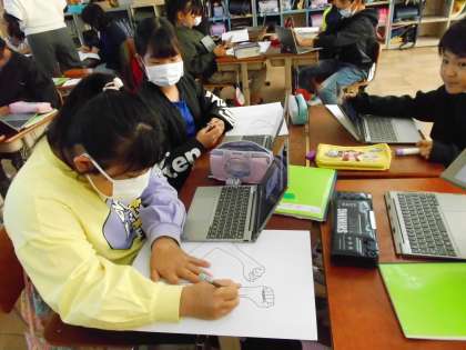理科では、筋肉のつくりがどうなっているのか予想をしたあとに、模型やタブレットを使って調べました。