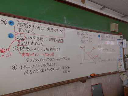 今までも地図などで縮図を見てきたことを思い出し,実際の長さに戻すためには,縮尺した分を倍すればいいんだと見つけ出し,いろいろな距離を測ってみたいと意欲をもっていました。