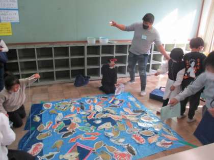 魚つりは、磁石のついた釣りざおで、ラミネートされた魚を次々と釣り上げていました。