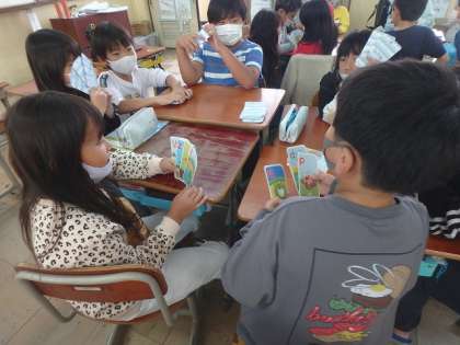 「Go fish」というカードゲームをしながら,カードをもらうときの言い方に慣れました。「〇〇card please.」「Here you are.」とスムーズにやりとりができていました。