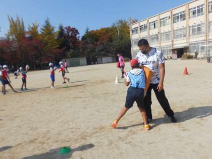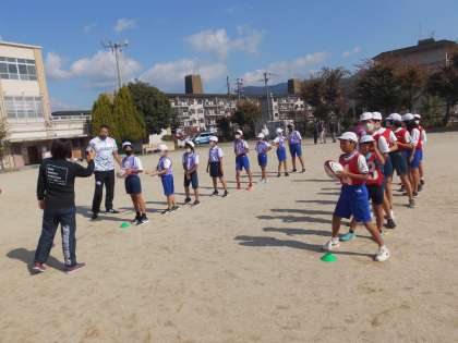 教えに来ていただいた講師の方も,子ども達に積極的にかかわっていただいたので,子ども達もどんどんラグビーの楽しさに引き込まれていました。