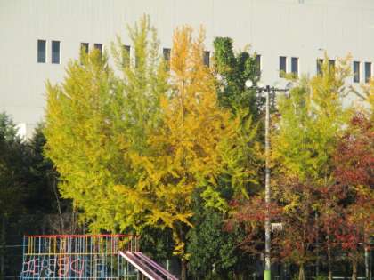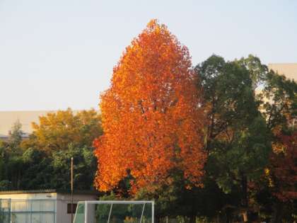 運動場の大きな木の紅葉がピークを迎えています。