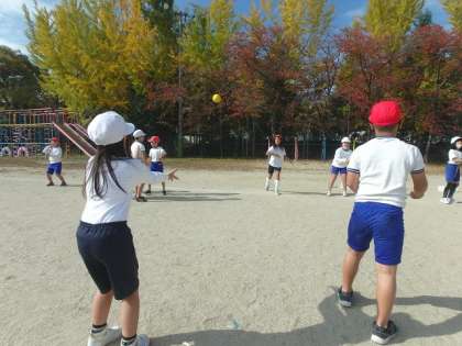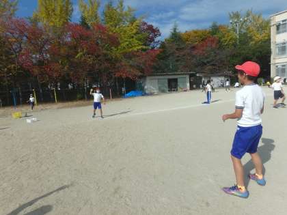 次の学習はベースボールです。この日はポートボールのゲームが1試合で終わったため,次の学習のベースボールの体慣らしの運動に取り組みました。