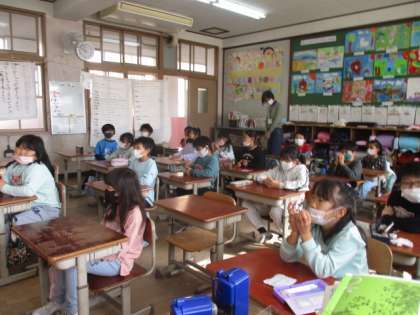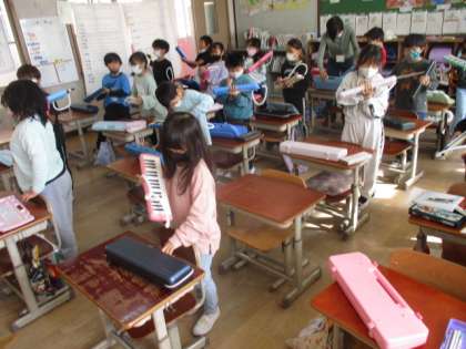 「手のひらを太陽に」、「大きな古時計」の歌の歌詞の確認をして、歌詞にあうような歌い方で練習をしました。
