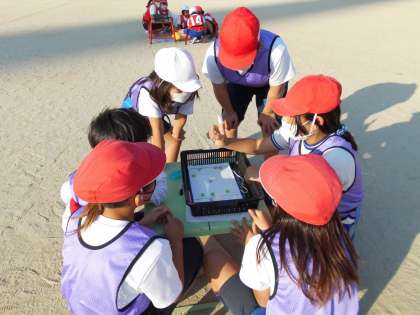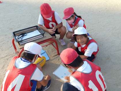 だいぶルールにも慣れてきた様子の子ども達。チームでの作戦会議にも力が入っています。