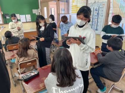 6年生が教室に来て、外国語の学習で作った有名人クイズを紹介してくれました。