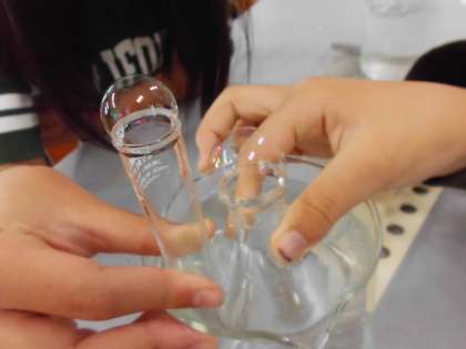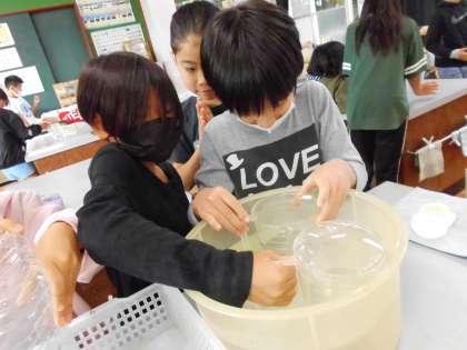 お湯に入れるとシャボン玉のように膨らみ、氷水に入れるとどんどんへこんでいくことが分かりました。「試験管よりも大きいもので実験してみたい!」という声があがったので、大きいものでも実験をしてみました。
