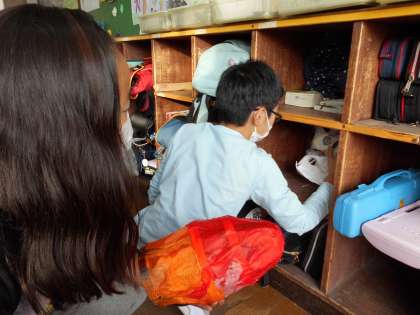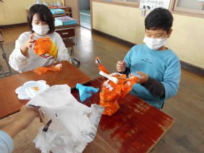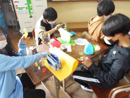 図画工作で和紙を使って、光のすけ具合を楽しみながらライトスタンドを作っています。一人一人の思いに合わせたライトスタンドが出来上がってきました。
