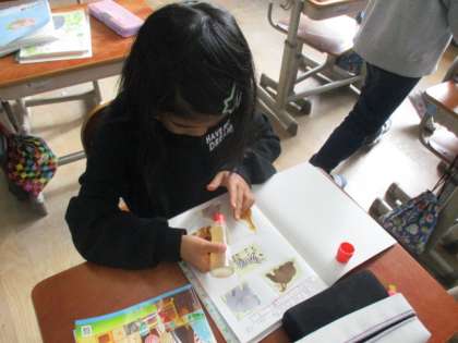 今日は教科書に載っている動物の周りを点と点でつないで、できあがった形を仲間分けしていきました。