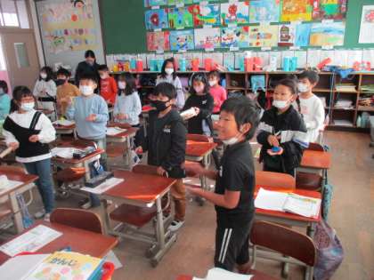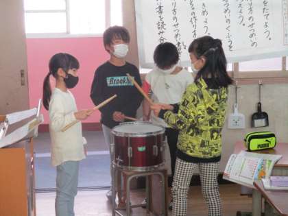 「かぼちゃ」の曲のリズムをいろいろな楽器を使って表現しました。
