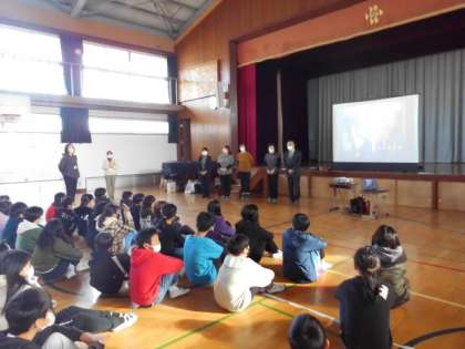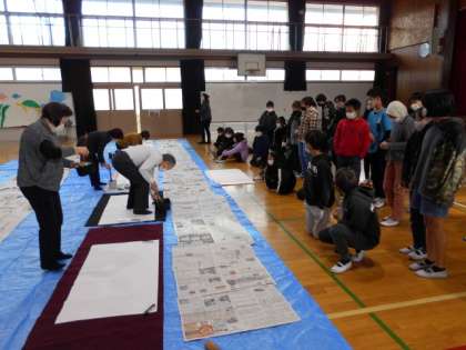 まずは,体育館で昔から今に至るまでの文字の変遷をお話してもらい,実際に大きな半紙に「挑む」という字をいろいろな書体で書いていただきました。