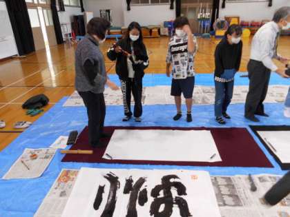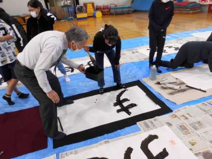 今まで持ったことのない大きな筆を持ち,書いたことのない字を書くことに少しとまどいもあったようですが,先生に教えてもらいながら,しっかり書きあげていました。