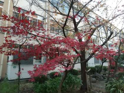 12月となり、寒さが一段と厳しくなってきました。校庭の木々の葉もいつのまにか落ち葉となっていますが、中庭には真っ赤に紅葉している木があります。大きな行事は終わりましたが、日々の学習に一生懸命取り組む子どもたちにエールを送っているようです。
