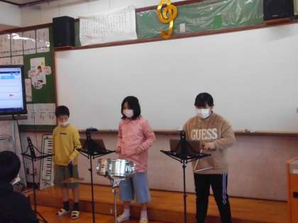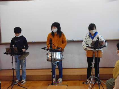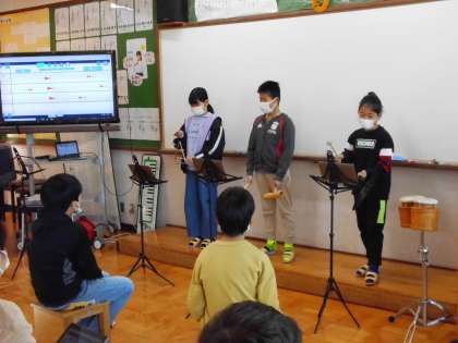 打楽器で音楽づくりをしていたので、発表会をしました。どんな音楽にしたのか、どんな工夫をしたのかを伝え、発表をしました。それぞれ面白い工夫がたくさんありました。