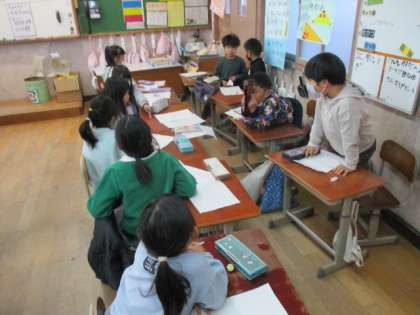 町探検に出かける計画を立てています。町探検での約束をみんなで確認した後,グループごとに調べたいことをまとめました。町探検に行ける日を楽しみにしています。