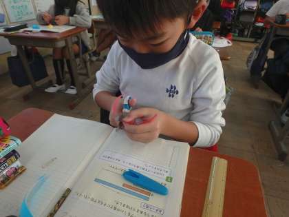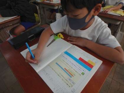 分数の学習に取り組んでいます。この日は2年生での学習を思い出しながら,「1mの〇分の△」といった表し方を学習しました。