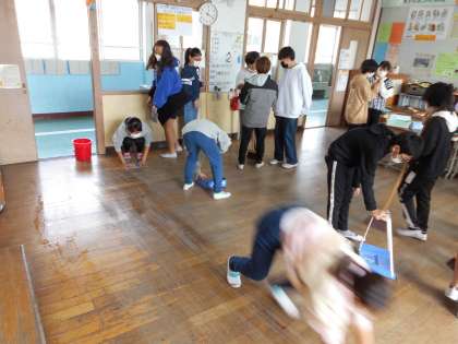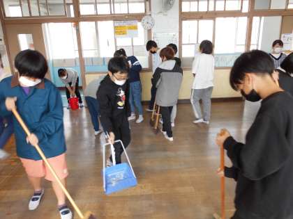 版画が始まると、削りかすがどうしてもたくさん出てしまいます。すると、片づけをする時間になると、みんなで声を掛け合って「机下げよう。」「床も拭こう。」と数分の短い時間でしたが、協力しながら全員で掃除をしていました。