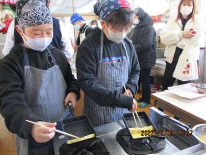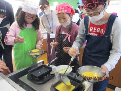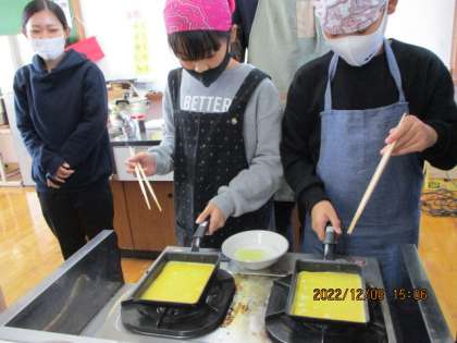 卵液をざるでこしてから、いよいよ焼いていきます。