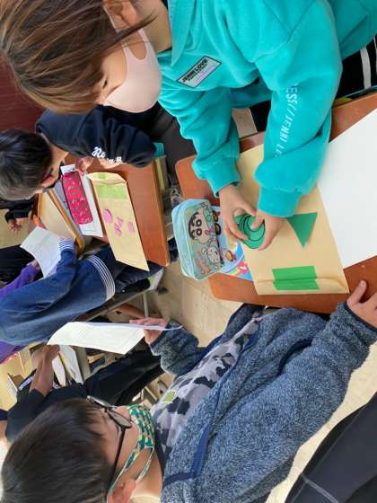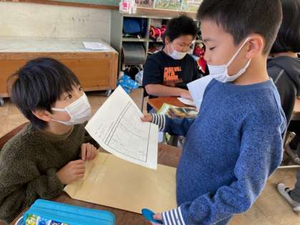 グリーティングカードを作るために,自分が必要な形や色を尋ねる活動をしました。