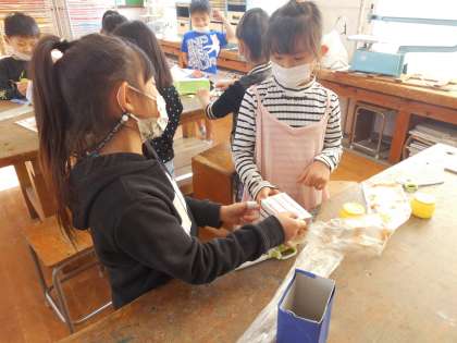 飛び出す様子を思い浮かべて、袋や箱などに絵を描いたり、紙を貼ったりしました。