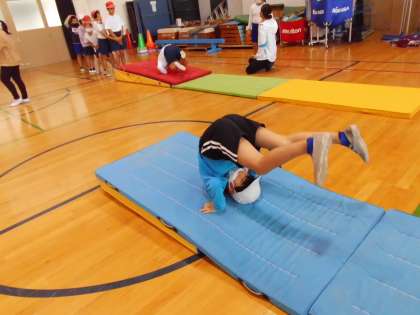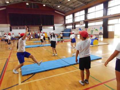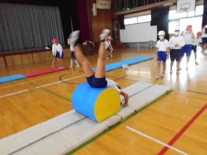 体育の「マット運動」の学習のねらい(2)では、少し頑張ればできそうな技に挑戦しています。様々な場を使って、友達とアドバイスをしあいながら進めています。