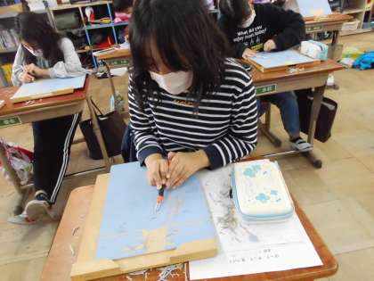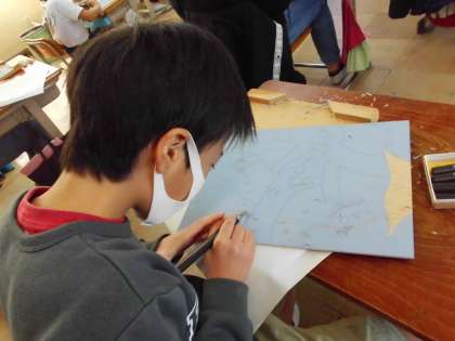 版画の学習では、安全に気をつけながら彫刻刀を使っています。「彫刻刀楽しい!!」と夢中になって彫っていました。