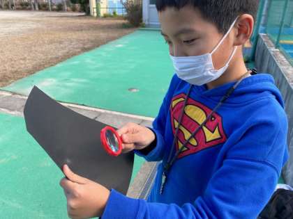 虫眼鏡で日光を集めると,温かさや明るさはどうなるのかを確かめました。子どもたちは安全に気を付けながら,分かったことや考えたことを次々に話し合っていました。