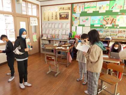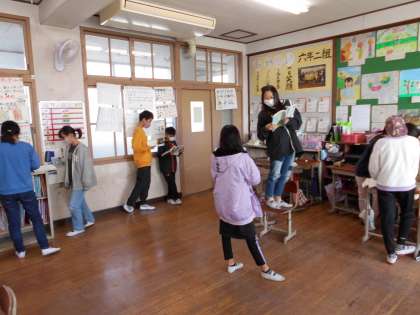 国語の「柿山伏」の学習では,ペアを作り柿主と山伏に分かれて音読劇の練習をしています。