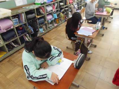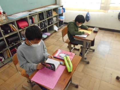 国語の学習で、同世代が出てくる本を読んで紹介文を書きました。その紹介を見ながら、味見読書をしました。紹介文を読んで、紹介文に書かれている本を3分間読みました。もっとたくさん読みたいという気持ちになりました。