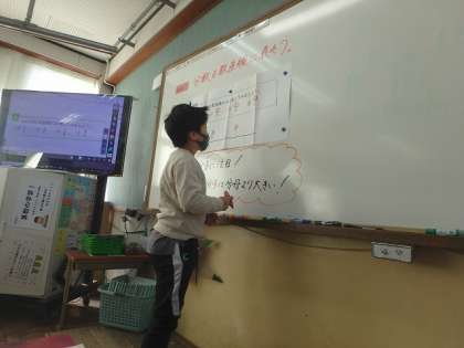 分数を数直線上に表しました。数直線上に表すと大きさが分かりやすくなることや分子が分母より大きくなることもあることを学びました。