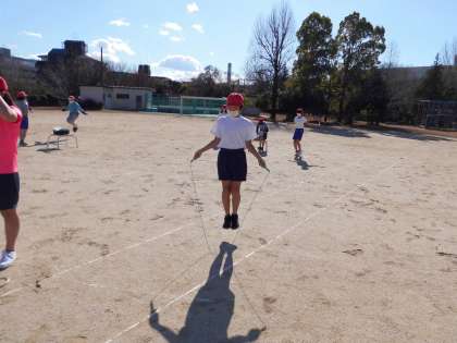 短なわとびで自分の出来る技にチャレンジしたり,班ごとに長なわと短なわを組み合わせて跳んでみたりしました。