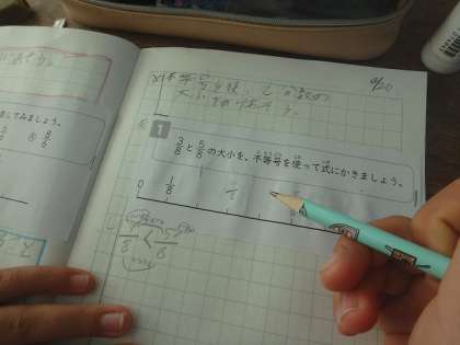 不等号を使って,分数の大小を表しました。「分子に注目すればいい!」ということに気付いた子どもたち。分母が同じ時には,分子と分子を比べるとよいということに気付くことができました。