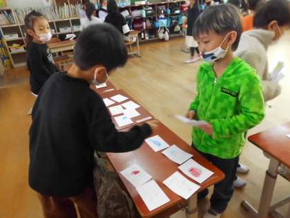 そのことを生かし、お店屋さんごっこをしました。何のお店にするかを考え、そのお店に置くものをグループで出し合い、カードを作りました。