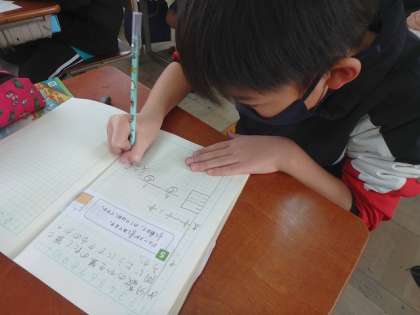 分数の引き算に挑戦です。「たし算と同じように計算できそう!」と子どもたち。子どもたちのノートには図や言葉を使って,自分なりの考えがしっかりと書かれていました。