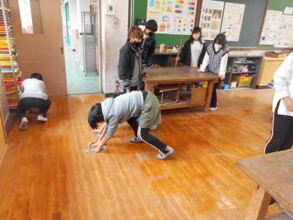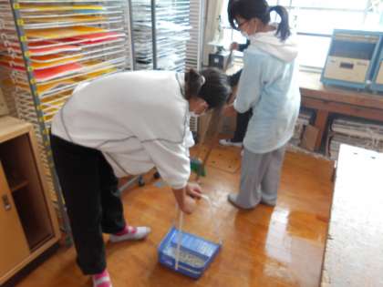 図工室で版画の学習をしています。学習が終わると、さっと掃除用具を用意したり、床ぞうきんをしたり、机をどかしたり・・・みんなが協力して毎回大掃除を短時間で行うことができます。誰かのために心を尽くして掃除をすることができるみなさんは最高の6年生です!