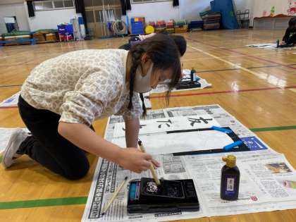 初めて体育館で大きな画仙紙に字を書いた子どもたち。腰をぐっと上げて,良い姿勢で書くことも意識しました。