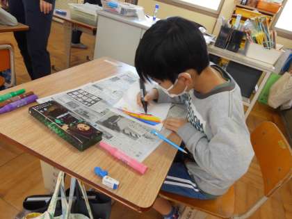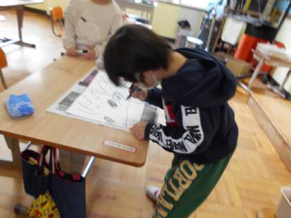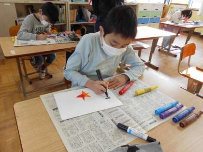 「お正月のあそびをしよう」の学習でたこを作りました。画用紙と毛糸を使って作りました。画用紙を折って,飛行機のような形にすると,うまくあがります。