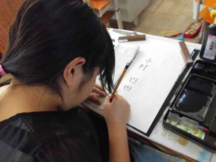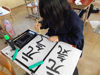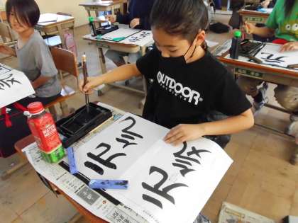書写では、毛筆で「元気」という字を書きました。今まで習ったことを生かして、「はらい」や「はね」、文字のバランスなどに気をつけながら書くことができました。中には、自分の名前を練習してから本番に臨む子もいました。